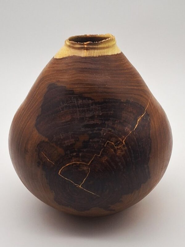 Cracks glued and painted with Roberson ‘Royal Gold’ liquid metal acrylic paint – my simple Kintsugi method. Finish: Woodoc low gloss.